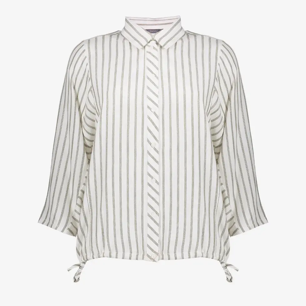 Ce chemisier de notre collection S26-1 est confectionné dans un tissu léger orné de fines rayures argentées, lui conférant un éclat subtil. Sa coupe décontractée et ses manches trois-quarts dessinent une silhouette fluide, tandis que son col classique lui apporte une touche d'élégance. Idéal avec un pantalon ou un jean pour un look moderne et stylé.