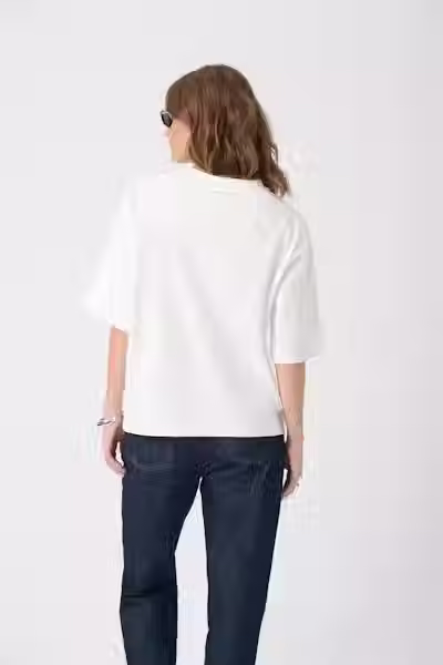 T-shirt à la coupe carrée et droite, col rond et manches courtes. Son fini lisse et doux et son design minimaliste lui confèrent un style décontracté et moderne.
